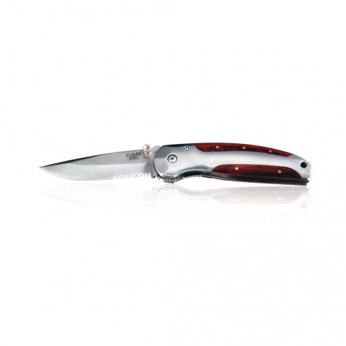 Ніж з нержавіючої сталі з дерев'яною ручкою та металевим затиском.