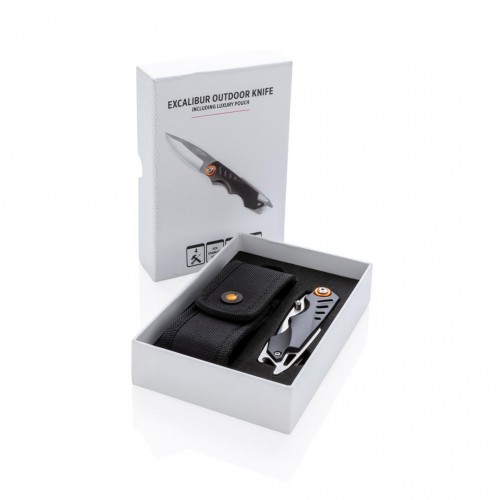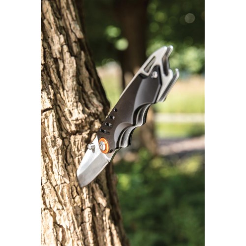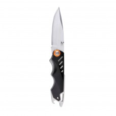Надміцний ніж з 4 функціями. Упакований у розкішній подарунковій коробці, включаючи високоякісний чохол 1680D. Алюмінієвий матеріал корпусу і інструменти з нержавіючої сталі. Інструменти включають: Складаний лезо, замок вкладиша, затиск для стрічки, відкривачка для пляшок.